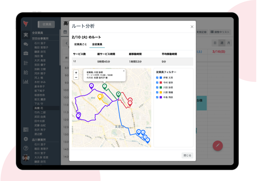 移動時間、スタッフの勤務時間、休み希望、過去のサービス履歴などを基にシフトの自動配列ができます。無駄な移動時間を減らし、サービス時間が増やせるようになります。