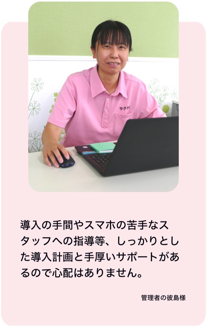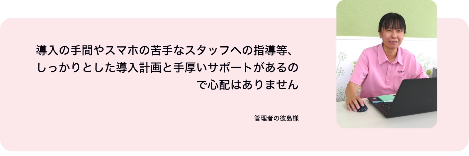 シフト、実施記録のチェックが予想以上に楽になりました。こんなに楽になるならもっと早く入れればよかったです