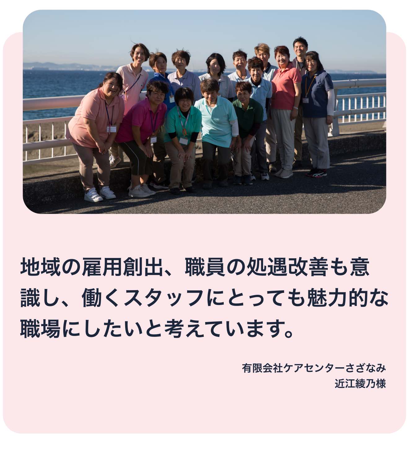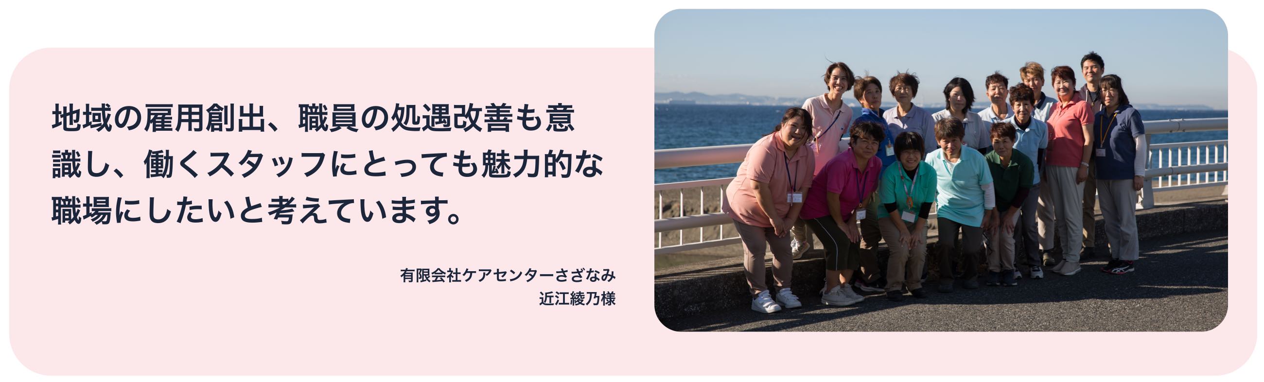 さざなみさんから最初に頂いた問い合わせは「見た目やUIがとても好きで、お話が聞きたい」といったもので大変印象に残っております。弊社も見た目や快適さで好きになれることは、時よっては機能の多さよりも大事であると考えているので、このような理由で導入頂きとても嬉しく思います。日本全体の高齢化率増加を見据えて、さざなみさんの介護サービスの提供だけでなく、地域雇用の担い手でもあるという気概に大変感銘を受けております。